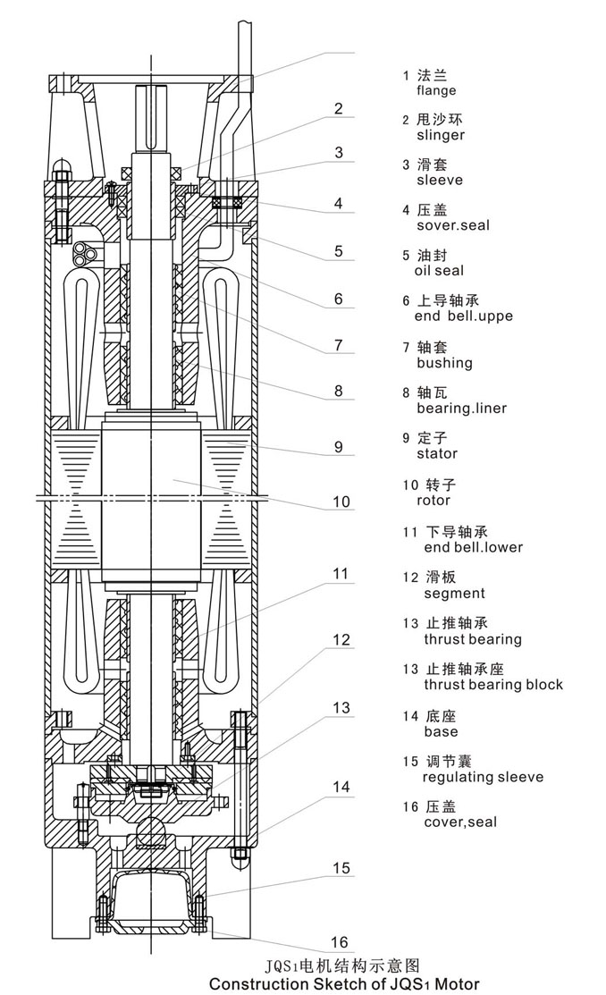 電動(dòng)機(jī)機(jī)構(gòu) - 潛水電機(jī)由定子、轉(zhuǎn)子、上下導(dǎo)軸承、下連接法蘭、底座、軸伸密封裝置等組成。