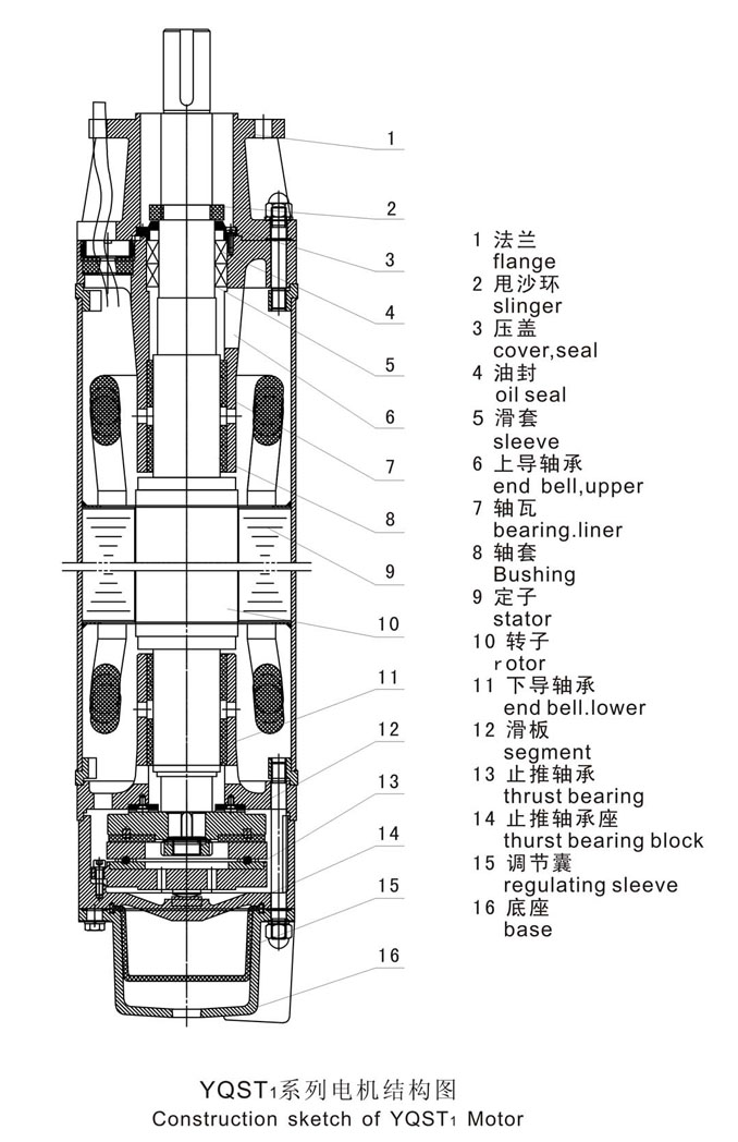 概述 YQST系列大容量潛水三相異步電動(dòng)機(jī)是應(yīng)國(guó)際市場(chǎng)需要,在小井徑中發(fā)展大容量電機(jī)而專門開(kāi)發(fā)的一種新型潛水電機(jī),他特別適用于高揚(yáng)程潛水泵配套提取地下水,為城市工礦企業(yè)、農(nóng)業(yè)灌溉及居民生活提供生產(chǎn)和生活用水。本產(chǎn)品除具備一般井用潛水電機(jī)特點(diǎn)外,還具有單機(jī)容量大,力能指標(biāo)高,承受軸向力大,密封性能好等特點(diǎn)。為了適應(yīng)用花需要,電機(jī)機(jī)殼可采用不銹鋼材料,但需在合同中注明。 型號(hào)說(shuō)明
