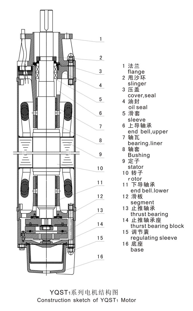 概述 YQST系列大容量潛水三相異步電動機是應(yīng)國際市場需要,在小井徑中發(fā)展大容量電機而專門開發(fā)的一種新型潛水電機,他特別適用于高揚程潛水泵配套提取地下水,為城市工礦企業(yè)、農(nóng)業(yè)灌溉及居民生活提供生產(chǎn)和生活用水。本產(chǎn)品除具備一般井用潛水電機特點外,還具有單機容量大,力能指標(biāo)高,承受軸向力大,密封性能好等特點。為了適應(yīng)用花需要,電機機殼可采用不銹鋼材料,但需在合同中注明。