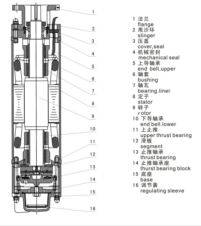 注:高推力型軸承需特殊訂貨,采用高推力型軸承的電機(jī)性能由用戶與制造廠協(xié)議。適用條件 1、電動機(jī)應(yīng)完全潛入水中立式(或臥式適用),其潛入深度不大于70m,但不小于20m,最底位置距井底不少于5m(臥式使用時(shí)水位應(yīng)高于潛水電機(jī)1m以上)。 2、介質(zhì)水溫不高于20℃。 3、水中固體雜質(zhì)含量(重量比)不超過0.01%。 4、水中氯離子含量不得超過400mg/L; 5、水中硫化氫含量不得大于1.5mg/L; 6、介質(zhì)水中不含腐蝕性物質(zhì),PH值在6.5-8.5范圍內(nèi)。 7、電機(jī)運(yùn)行時(shí)內(nèi)部應(yīng)充滿潔凈的清水(可加防凍液)。 設(shè)備特點(diǎn) ★ 電機(jī)防護(hù)等級:IPX8,絕緣等級為F; ★ 充水式潛水電動機(jī)結(jié)構(gòu)簡單,定轉(zhuǎn)子繞組和鐵心直接浸在水中,冷卻效果好、輸出功率大、效率較高。 ★ 由于充水式潛水電動機(jī)內(nèi)腔所充多為清水,使用過程中產(chǎn)生的滲漏對所安裝使用井水水質(zhì)不會產(chǎn)生污染。 ★ 充水式潛水電動機(jī)的定子繞組。鐵心很軸承均在水中工作,對定子繞組所使用上網(wǎng)導(dǎo)線及其加工工藝、接頭材料及包扎工藝、水潤滑軸承的結(jié)構(gòu)、材料及加工工藝、鐵心與金屬材料的防銹防腐蝕處理等有很高的要求。 電動機(jī)結(jié)構(gòu) 1、 潛水電機(jī)由定子、轉(zhuǎn)子、上下導(dǎo)軸承、下連接法蘭、底座、軸伸密封裝置等組成。 2、 潛水電機(jī)各止口連接處采用密封圈密封;軸伸密封根據(jù)水質(zhì)含砂量多少,選擇不同方式的密封裝置。(含砂量大于0.01%時(shí)采用橡膠骨架油封;含砂量大于0.01-0.5%時(shí)采用機(jī)械密封) 3、 電動機(jī)下部裝有橡膠調(diào)節(jié)囊,其作用為當(dāng)電機(jī)內(nèi)部熱脹冷縮時(shí)及電機(jī)外部水位高低變化時(shí),用以平衡電機(jī)內(nèi)腔與水的壓力。 4、 電動機(jī)定子繞組采用耐水絕緣線,有良好的絕緣能力,繞組線與耐水JHS型電纜連接。 5、 潛水電機(jī)上、下導(dǎo)軸承座內(nèi)裝有軸瓦,轉(zhuǎn)子下部裝有止推軸承。止推軸承由上、下止推軸承及滑板組成,用于承擔(dān)軸向力。 技術(shù)支持 1、保證電機(jī)的引出電纜處端電壓為380(1±5%)V,頻率為50(1±1%)HZ(其它電壓或頻率須特殊訂貨)。 2、電機(jī)的******運(yùn)行電流不得大于銘牌上的標(biāo)定值(即額定電流,配套廠家和用戶在選用和調(diào)試潛水電泵機(jī)組的電源控制設(shè)備時(shí),應(yīng)特別注意); 3、電機(jī)應(yīng)選用合適的控制方式(可實(shí)現(xiàn)電機(jī)的過載、欠壓、斷相運(yùn)行的保護(hù)并可根據(jù)水位自動控制電泵的起停); 4、電機(jī)為連續(xù)工作制(S1)。兩次起動時(shí)間間隔不得小于10分鐘; 5、電機(jī)應(yīng)可豎直使用,也可臥式使用(須特殊訂制); 6、用于水池或超過規(guī)定的井徑中時(shí)應(yīng)加裝吸水罩,使電機(jī)表面的水流速度達(dá)到0.5-1m/s,以保證電機(jī)良好的散熱。吸水罩應(yīng)將電動機(jī)和第一,二級泵包括在內(nèi)。 供貨范圍 潛水電機(jī)主機(jī)(包括3米引纜),電纜的接頭絕緣粘帶(包括優(yōu)質(zhì)聚氯乙烯粘帶、自熔乙丙膠帶、丁基橡膠自粘帶)使用維護(hù)說明書1份,合格證1份裝箱單1份,木箱包裝。 注:當(dāng)環(huán)境水或電網(wǎng)電壓、頻率不符合上述規(guī)定時(shí),用戶可以提出要求,本公司提供訂制適用產(chǎn)品。