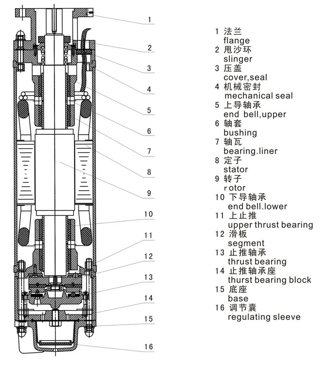 注:高推力型軸承需特殊訂貨,采用高推力型軸承的電機(jī)性能由用戶與制造廠協(xié)議。適用條件 1、電動(dòng)機(jī)應(yīng)完全潛入水中立式(或臥式適用),其潛入深度不大于70m,但不小于20m,最底位置距井底不少于5m(臥式使用時(shí)水位應(yīng)高于潛水電機(jī)1m以上)。 2、介質(zhì)水溫不高于20℃。 3、水中固體雜質(zhì)含量(重量比)不超過0.01%。 4、水中氯離子含量不得超過400mg/L; 5、水中硫化氫含量不得大于1.5mg/L; 6、介質(zhì)水中不含腐蝕性物質(zhì),PH值在6.5-8.5范圍內(nèi)。 7、電機(jī)運(yùn)行時(shí)內(nèi)部應(yīng)充滿潔凈的清水(可加防凍液)。 設(shè)備特點(diǎn) ★ 電機(jī)防護(hù)等級(jí):IPX8,絕緣等級(jí)為F; ★ 充水式潛水電動(dòng)機(jī)結(jié)構(gòu)簡(jiǎn)單,定轉(zhuǎn)子繞組和鐵心直接浸在水中,冷卻效果好、輸出功率大、效率較高。 ★ 由于充水式潛水電動(dòng)機(jī)內(nèi)腔所充多為清水,使用過程中產(chǎn)生的滲漏對(duì)所安裝使用井水水質(zhì)不會(huì)產(chǎn)生污染。 ★ 充水式潛水電動(dòng)機(jī)的定子繞組。鐵心很軸承均在水中工作,對(duì)定子繞組所使用上網(wǎng)導(dǎo)線及其加工工藝、接頭材料及包扎工藝、水潤(rùn)滑軸承的結(jié)構(gòu)、材料及加工工藝、鐵心與金屬材料的防銹防腐蝕處理等有很高的要求。 電動(dòng)機(jī)結(jié)構(gòu) 1、 潛水電機(jī)由定子、轉(zhuǎn)子、上下導(dǎo)軸承、下連接法蘭、底座、軸伸密封裝置等組成。 2、 潛水電機(jī)各止口連接處采用密封圈密封;軸伸密封根據(jù)水質(zhì)含砂量多少,選擇不同方式的密封裝置。(含砂量大于0.01%時(shí)采用橡膠骨架油封;含砂量大于0.01-0.5%時(shí)采用機(jī)械密封) 3、 電動(dòng)機(jī)下部裝有橡膠調(diào)節(jié)囊,其作用為當(dāng)電機(jī)內(nèi)部熱脹冷縮時(shí)及電機(jī)外部水位高低變化時(shí),用以平衡電機(jī)內(nèi)腔與水的壓力。 4、 電動(dòng)機(jī)定子繞組采用耐水絕緣線,有良好的絕緣能力,繞組線與耐水JHS型電纜連接。 5、 潛水電機(jī)上、下導(dǎo)軸承座內(nèi)裝有軸瓦,轉(zhuǎn)子下部裝有止推軸承。止推軸承由上、下止推軸承及滑板組成,用于承擔(dān)軸向力。 技術(shù)支持 1、保證電機(jī)的引出電纜處端電壓為380(1±5%)V,頻率為50(1±1%)HZ(其它電壓或頻率須特殊訂貨)。 2、電機(jī)的******運(yùn)行電流不得大于銘牌上的標(biāo)定值(即額定電流,配套廠家和用戶在選用和調(diào)試潛水電泵機(jī)組的電源控制設(shè)備時(shí),應(yīng)特別注意); 3、電機(jī)應(yīng)選用合適的控制方式(可實(shí)現(xiàn)電機(jī)的過載、欠壓、斷相運(yùn)行的保護(hù)并可根據(jù)水位自動(dòng)控制電泵的起停); 4、電機(jī)為連續(xù)工作制(S1)。兩次起動(dòng)時(shí)間間隔不得小于10分鐘; 5、電機(jī)應(yīng)可豎直使用,也可臥式使用(須特殊訂制); 6、用于水池或超過規(guī)定的井徑中時(shí)應(yīng)加裝吸水罩,使電機(jī)表面的水流速度達(dá)到0.5-1m/s,以保證電機(jī)良好的散熱。吸水罩應(yīng)將電動(dòng)機(jī)和第一,二級(jí)泵包括在內(nèi)。 供貨范圍 潛水電機(jī)主機(jī)(包括3米引纜),電纜的接頭絕緣粘帶(包括優(yōu)質(zhì)聚氯乙烯粘帶、自熔乙丙膠帶、丁基橡膠自粘帶)使用維護(hù)說明書1份,合格證1份裝箱單1份,木箱包裝。 注:當(dāng)環(huán)境水或電網(wǎng)電壓、頻率不符合上述規(guī)定時(shí),用戶可以提出要求,本公司提供訂制適用產(chǎn)品。