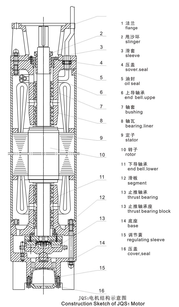 電動機(jī)機(jī)構(gòu) - 潛水電機(jī)由定子、轉(zhuǎn)子、上下導(dǎo)軸承、下連接法蘭、底座、軸伸密封裝置等組成。